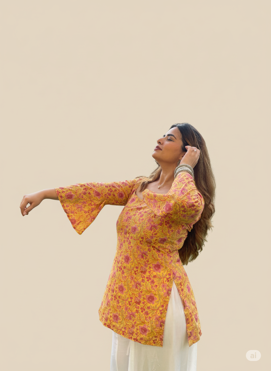 Brighten up your day with this beautiful yellow floral print kurti. Crafted in soft, breathable fabric, it blends comfort with ethnic charm — perfect for festive gatherings or casual days out. Pair it with white palazzos or jeans for an effortlessly stylish look.